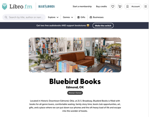 BLUEBIRD BOOKS is excited to partner with Libro.fm to be able to provide audiobook experiences for our customers that support local, independent bookstores. Each purchase benefits our bookstore in a way that helps us to be able to compete with major corporations.